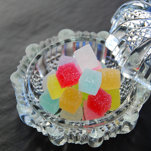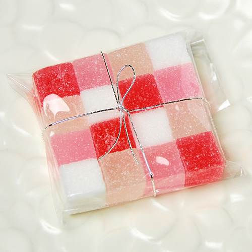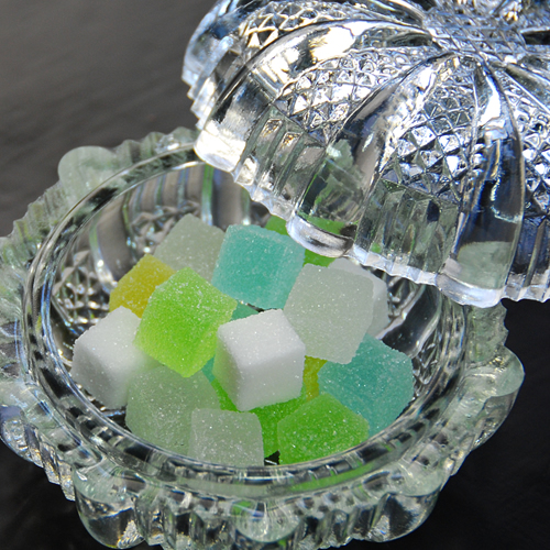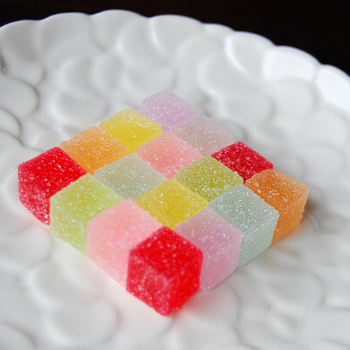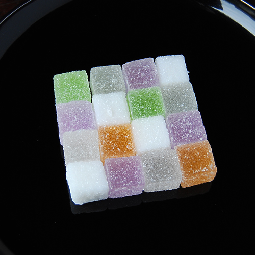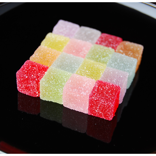 色とりどりのゼリーです。 うれしい色、ごきげんな色、やさしい色 ・・・すこしさびしげな色も交じっていますが、 どれもこれもフルーティな味と香りにくるまれた、 小さいながらも美しく愛らしい彩りです。 ひとつひとつお口にふくんで、 そう、クロスワード・パズルを解くように 「彩」 の気分をお楽しみ下さい。